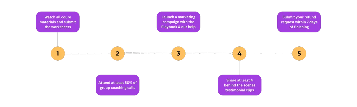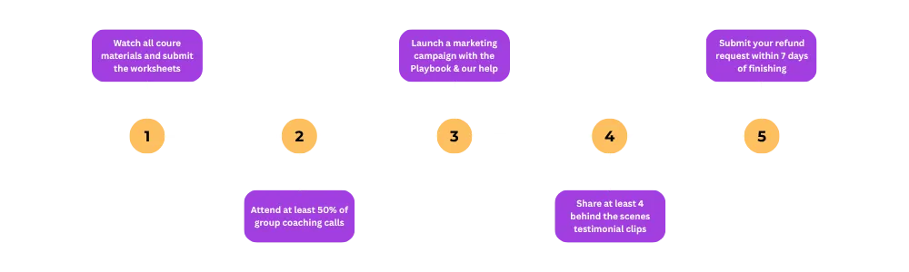 You follow the steps, submit the deliverables, attend the coaching, launch our proven marketing campaign, and share your journey - we'll refund your full investment of $5,000.